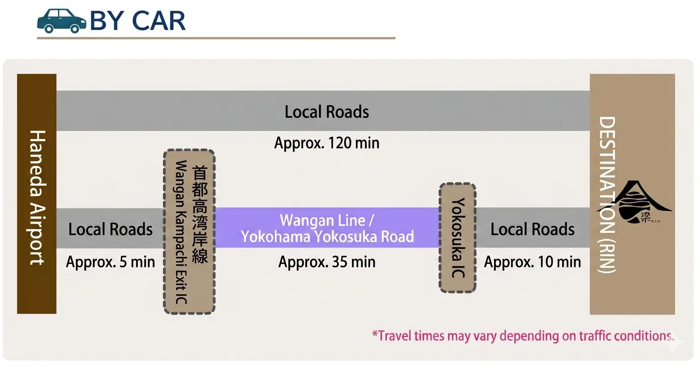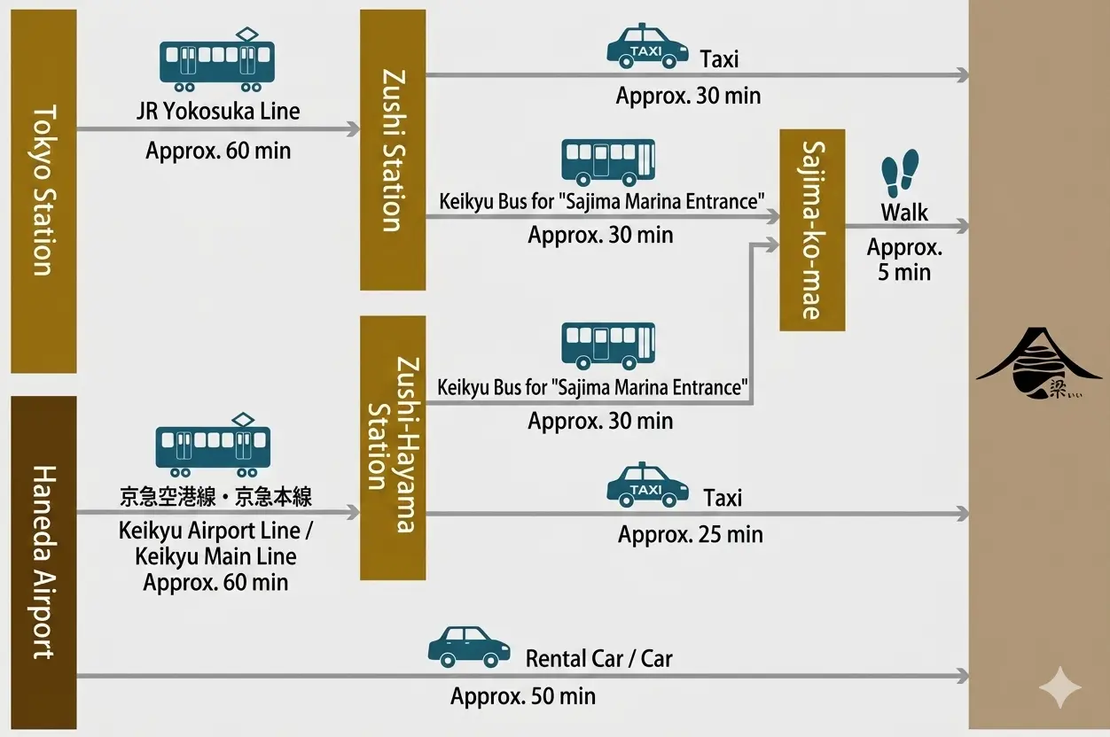 Zushi, Hayama, and Kamakura are about 30–40 minutes away by car,